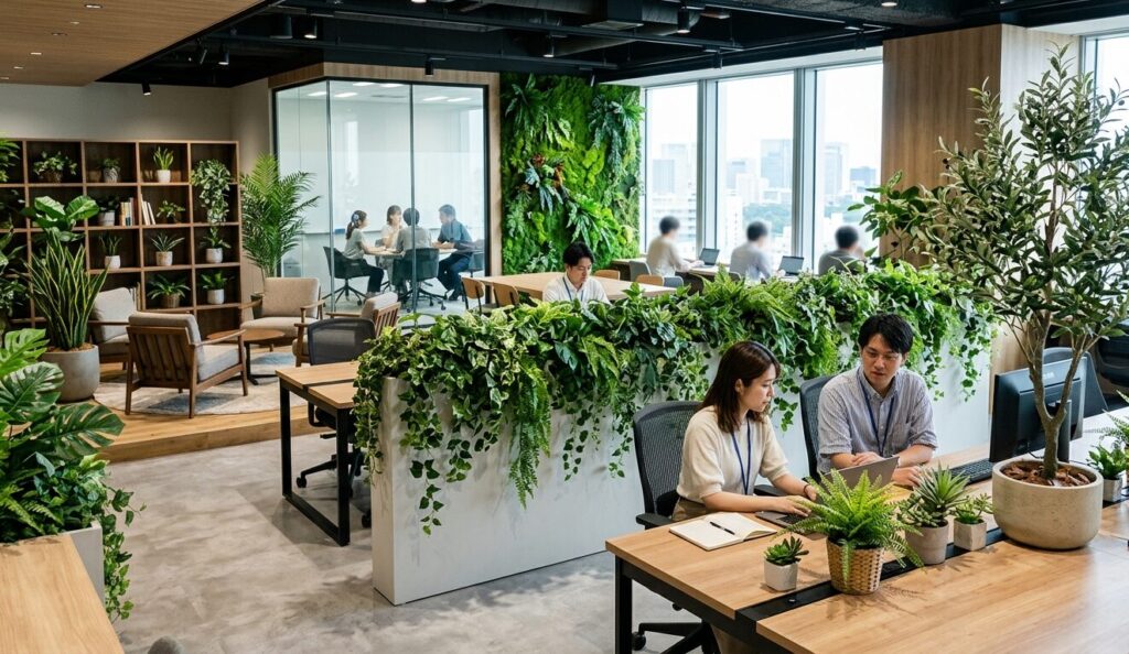 • ゾーニング効果: パーテーション代わりにフェイクグリーンを使うことで、圧迫感を与えずに「集中スペース」と「リラックススペース」を区切ることが可能です。