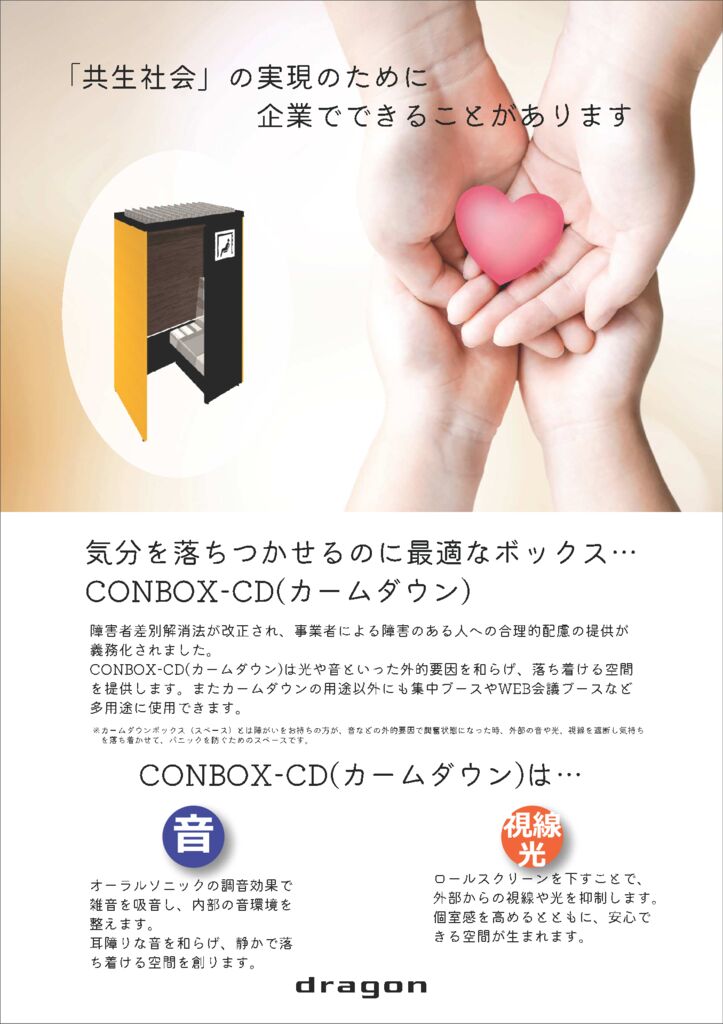 障害者差別解消法が改正され、事業者による障害のある人への合理的配慮の提供が義務化されました。弊社としましては、CONBOX-CD(カームダウン)の発売を開始いたしました。CONBOX-CD(カームダウン)は光や音といった […]